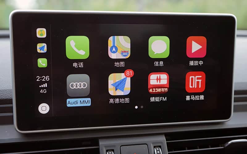 相比于老款,Q5L最显著的升级是电子化方面做得更加完善。8.3英寸的多媒体显示屏,虽然不支持触控,用换挡杆旁边的旋钮进行操作同样比较简便,而且支持手写板输入。系统最显著的进步就是支持carplay,将手机功能投射到显示屏上,常用的功能如电话本、导航、有声节目、音乐的快捷键都显示在桌面上,使用起来非常方便。