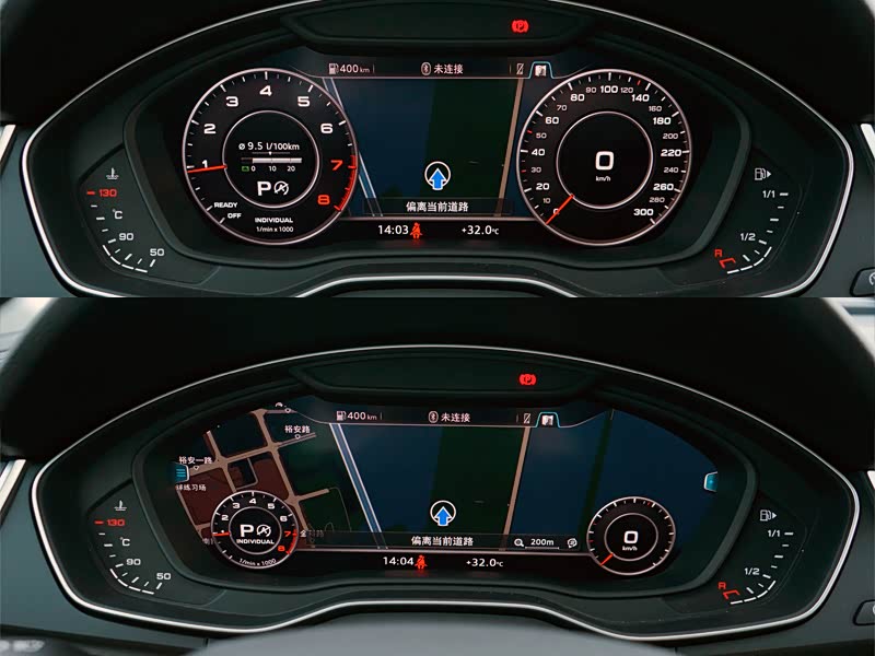 另外,仪表盘采用12.3英寸的纯液晶屏,这个屏幕的优势在于可以将导航、音频等信息投射过来,对于行车的安全性大有提升。通过方向盘上的多功能按键可以选择想要显示的信息,包括地图,车辆行驶里程,油耗,小计里程及油耗,车内用电器的使用情况等。还可以通过按键,将主仪表和地图界面的显示主次进行切换。在导航时,可以一键切换将转速,时速表缩小,导航的显示范围扩大,信息显示更加直观方便。