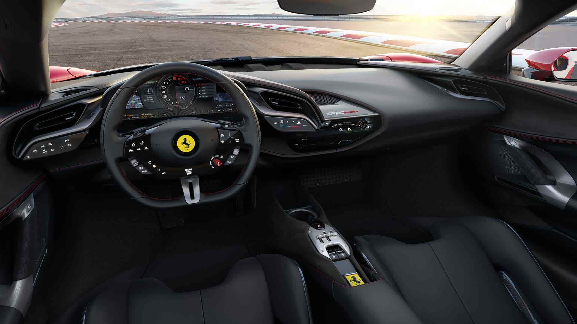 与法拉利全新的驾驶室造型相呼应,车内采用环绕式16.0英寸高清屏幕,先进的平视显示器和F1风格的驾驶舱,方向盘上可控制四种不同的驾驶模式:eDrive,Hybrid ,Performance和Qualify。正如名称所暗示的,前两个使用电池供电。以效率高环保为导向的eDrive模式完全关闭了V8发动机,完全依赖于电池组和电动机。在混合动力模式下,控制逻辑通过驾驶员踩油门的用力大小和行驶条件等信息自动在发动机和电池电源之间切换。