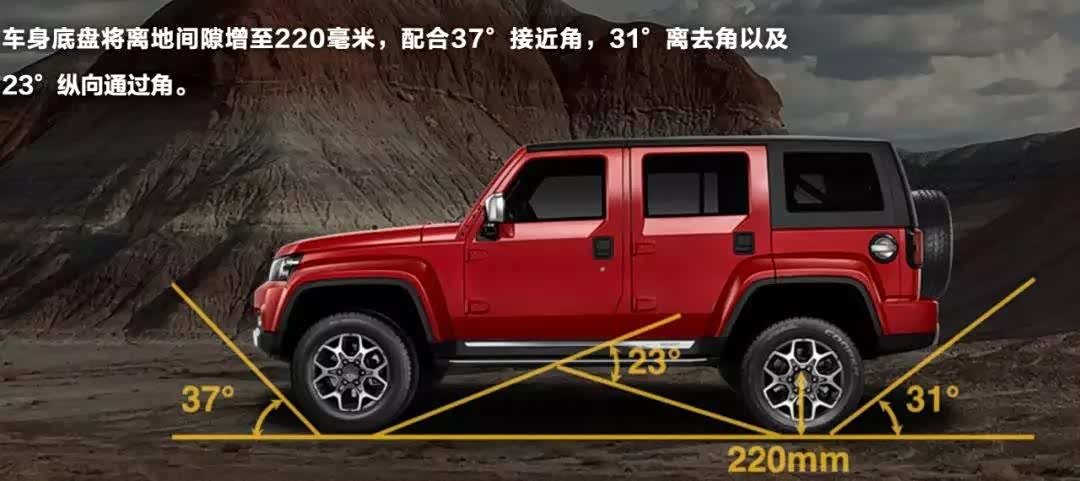 但其实BJ40的素车,就是越野车的底子。除去非承载式车身,和电控分时四驱系统之外,离地高度达到了22厘米,换来夸张的37°接近角和31°离去角,更适合攀爬类运动。