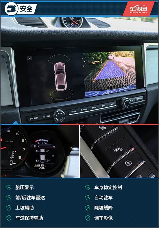 新款Macan基础版安全方面标配比较丰富,诸如胎压显示、车身稳定控制、车道偏离预警系统、前/后驻车雷达、定速巡航、发动机启停、自动驻车、陡坡缓降以及上坡辅助均有所配备。不过可支持选装的配置也不少,这台试驾车选装了银色组件,价值36800元,内部包含了停车辅助系统以及倒车摄像头,该摄像头分辨率在白天光线好时显示较为清晰,但在夜间的显示稍微逊色一些。