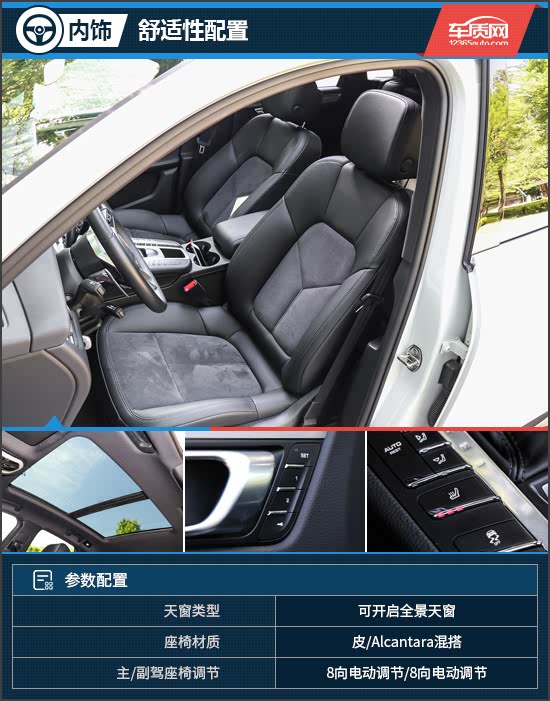 保时捷Macan在舒适性方面考虑的较为周到,头顶上方配有一个可开启全景天窗,开启面积较为出色。前排座椅整体表现令人满意,采用了皮质与Alcantara混搭设计,座椅的内部填充物较为柔软,两侧对腰部的包裹性也很好,简直无可挑剔,同时,配置方面还支持主副驾座椅8向电动调节、2组座椅记忆以及三挡座椅加热。