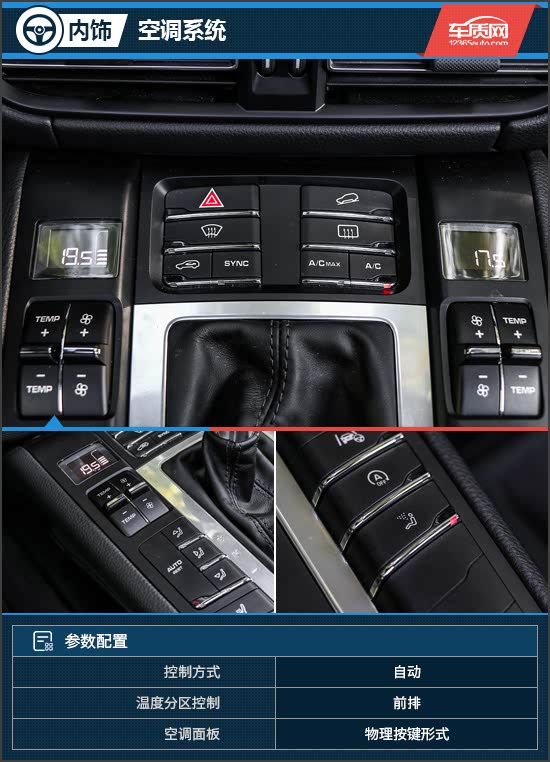 中控部分依旧采用密密麻麻的按键设计,其实当你熟悉之后会觉得没那么繁琐,这其中大部分按键均为空调设置,上方为温度、风量调节以及显示屏,下方为空调风向。同时,前排采用了温度分区控制,并配有自动空调。