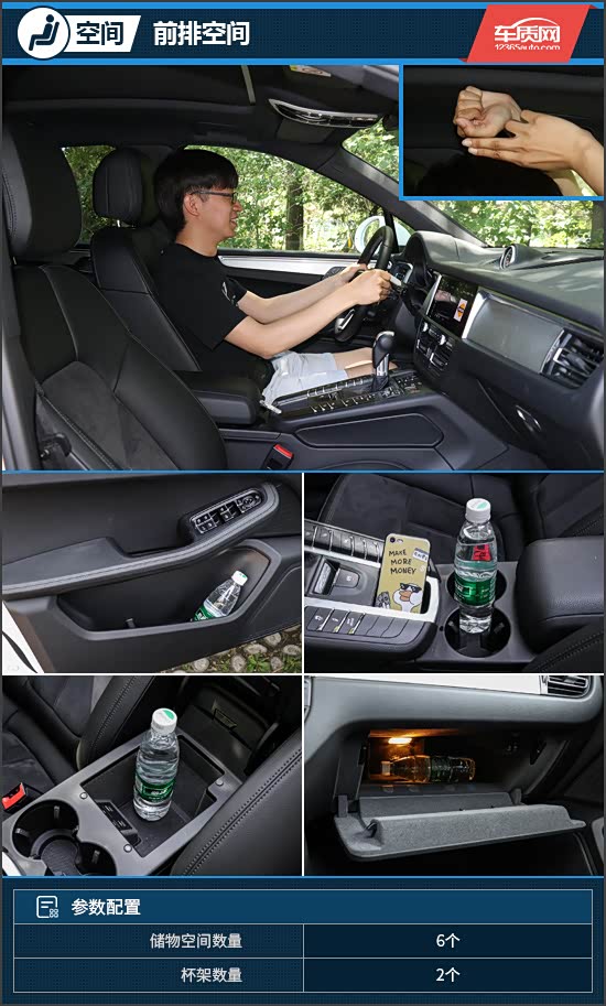 乘坐空间方面,身高为175cm的体验者进入前排,调整好座椅后,头部拥有一拳两指距离。储物空间方面,Macan储物空间数量较少,但容积表现不错。前门板储物槽容积巨大,并且开口较大,拿取物品十分便捷。挡把后方配有一个小型储物槽,内部配有一个12V电源,不用时可将手机放置于此,而在它的后方是两个带限位器的水杯架。此外,中央扶手箱和手套箱内部容积表现都非常不错,值得一提的是,中央扶手箱内部还配有2个USB接口。
