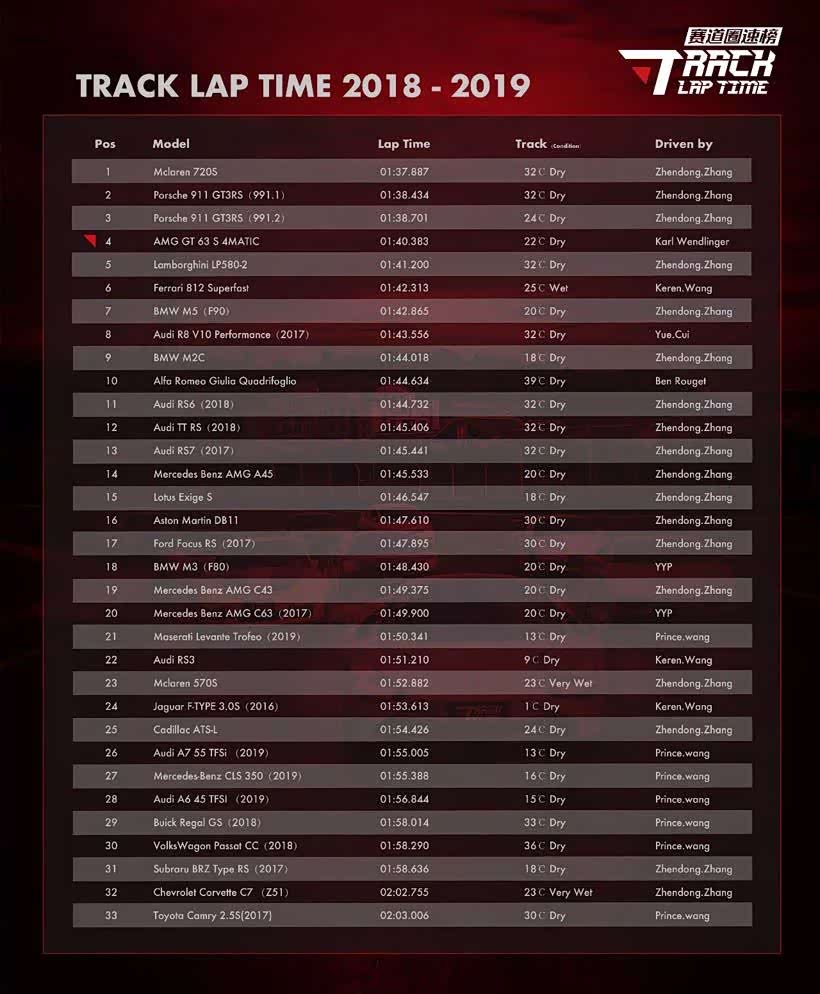 这也是为什么AMG GT 63 S能够在纽北创造7:25.41的最快四门四座量产车的记录。几日前,前F1车手Karl Wendlinger又在浙江赛车场驾驶这辆车创造了该类车型的最速记录——1:40.383,如果大家对这个成绩的好坏没有什么概念,那么在全部车型圈速总榜上,它排名第四,在它前面不到2秒的是保时捷911 GT3 RS。