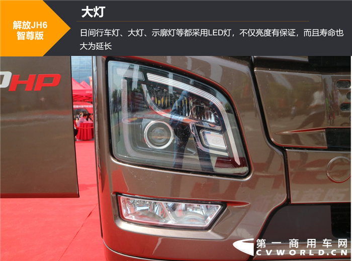 外观方面,解放JH6智尊版与之前的产品相比,最大的变化体现在大灯上。解放JH6智尊版的日间行车灯、大灯、示廓灯等都采用LED灯,不仅亮度有保证,而且寿命也大为延长,让车辆在全生命周期内都不需要更换灯泡。