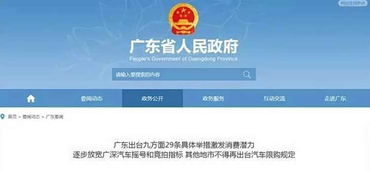 据了解,广东省早在5月底就发布了《广东省完善促进消费体制机制实施方案》,就提出放宽广州、深圳汽车摇号和竞拍指标,省内其他城市不得再出台汽车限购政策。