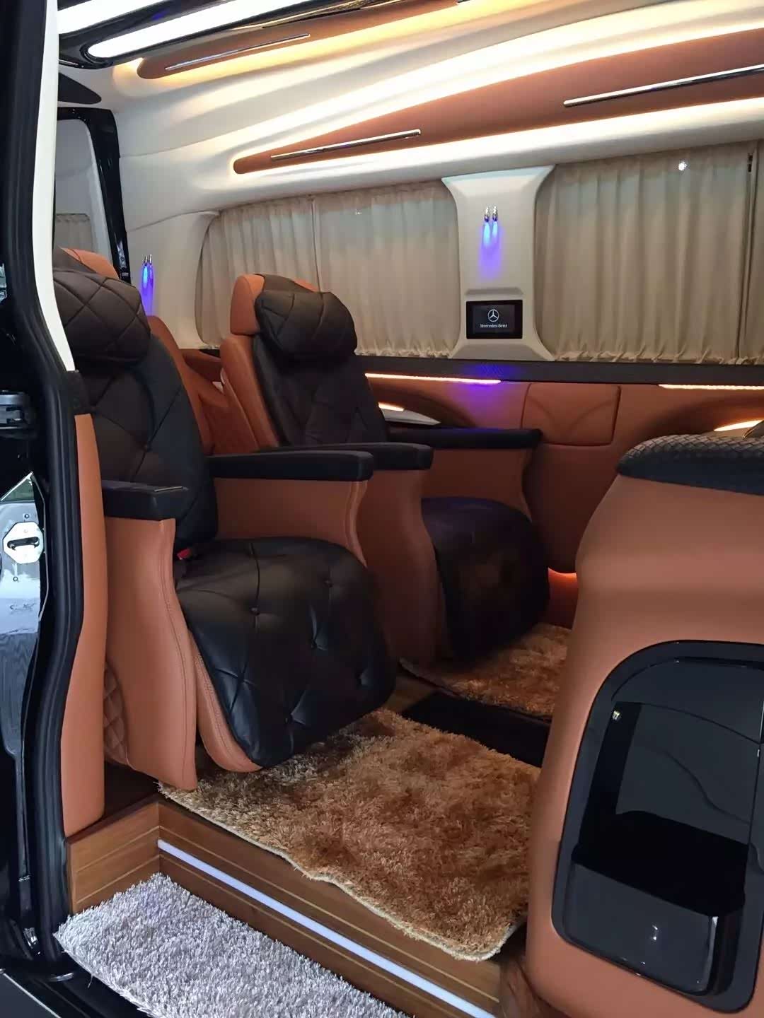 车内空间宽阔,色调明亮,座椅呈2+2+3=7型排列,整洁美观,真皮制作,柔软舒适,驾驶舱与乘客舱全隔断分开,但雾化玻璃解决了互通的问题。