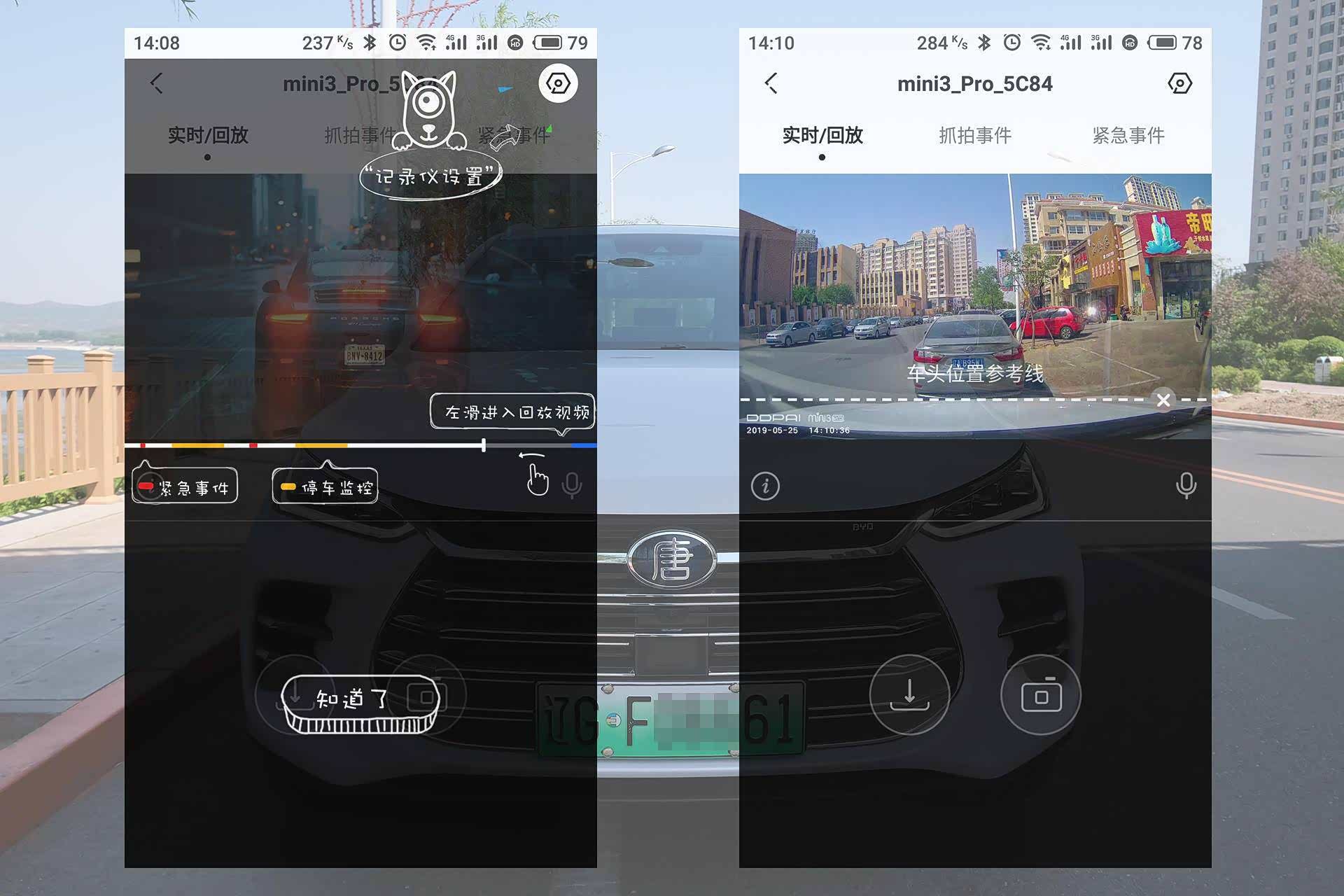 三款行车记录仪的App连接都很方便,都是通过记录仪自身释放WiFi热点来进行连接的,不过盯盯拍的App更为人性化吧,因为第一次进入的时候它会提示你应当调整镜头,白色参考线的位置应为车头的位置。其中盯盯拍和360行车记录仪的App设置里,都有图像畸形矫正的选项(实测过程中会发现70迈的畸变确实明显大于另外两款)。