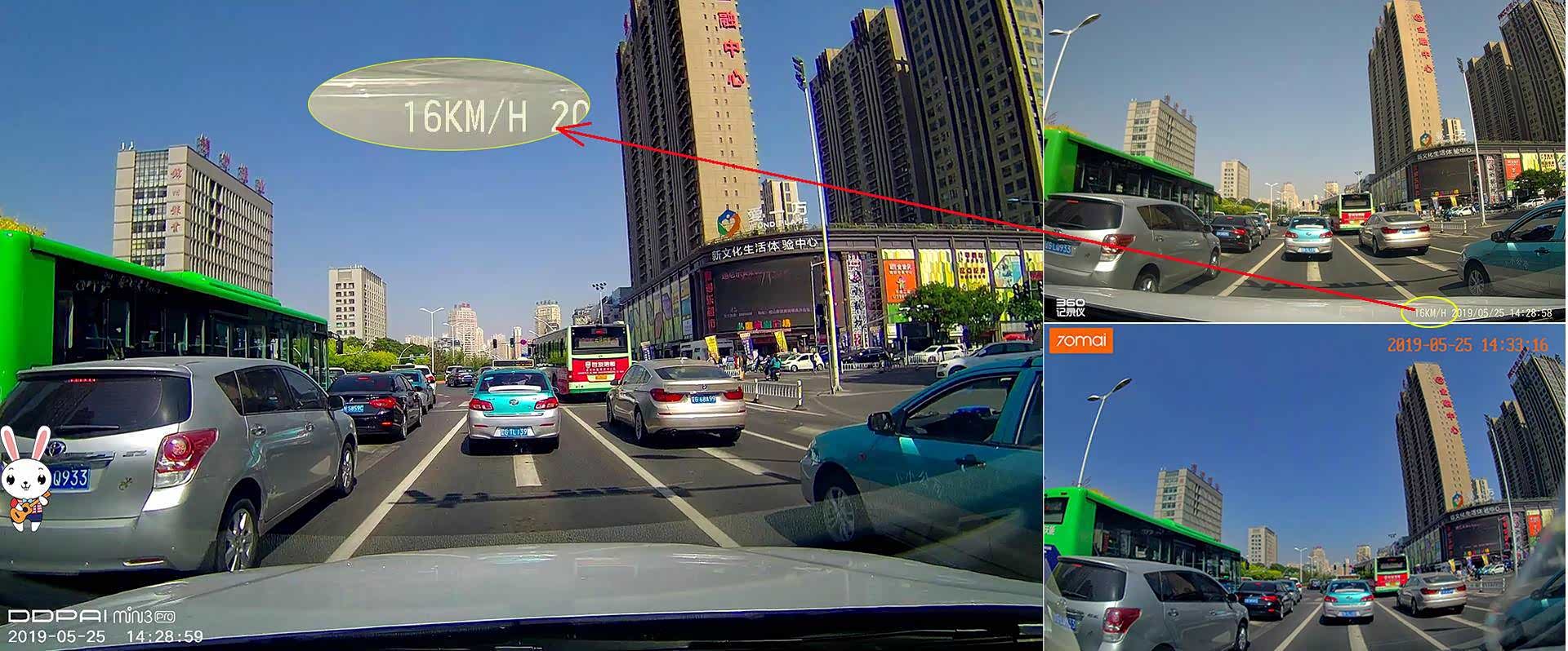 第三组图视频车的实时车速为76km/h(我能说市区道路这个车速已经超速行驶了么),尽管没监控,还是要提醒大家遵守限速规定哈。在右侧相邻车道上有一台丰田小车,让我们辨认下车牌号吧。
