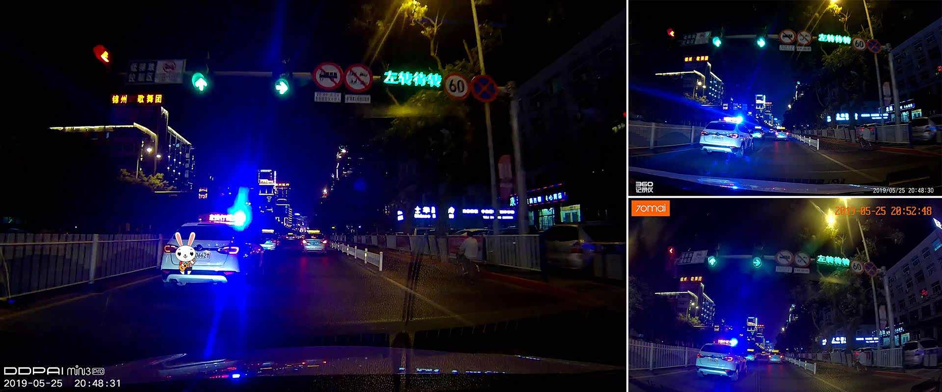 第二组图除了考验清晰度之外呢,我还故意跟在了一辆警车后面(我可没有干扰警察蜀黍工作哈,没有跑到他前面),那个警灯。。。实在是太刺眼了,也正好能看得出这3款行车记录仪会不会受影响。