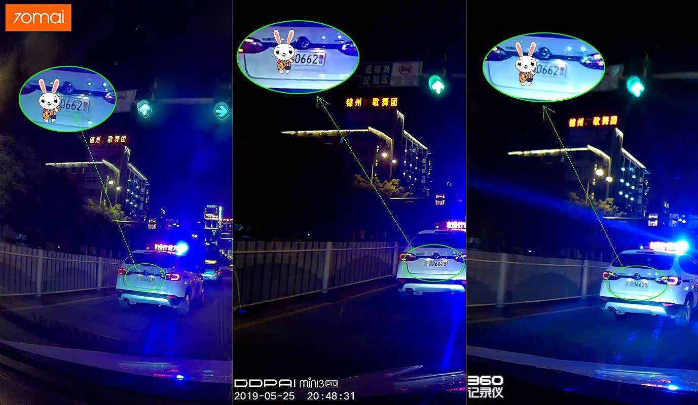 同样,通过放大图对比,不难发现警察蜀黍开的警车车牌尾号为“0662警”,由于有警灯蓝色光线的干扰,所以三款行车记录仪的画面都有所影响。首先,还是先看清晰度,360 G600又出现了一层“雾气”,70迈pro比360更为清晰,“警”字有点模糊,盯盯拍mini3pro的“警”字依然清晰。