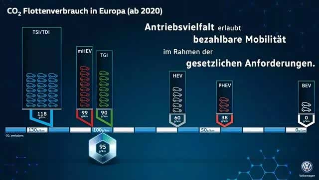 ▲大众品牌碳排量均值路线图,mHEV车型与TGI分别在阈值95g/km两侧