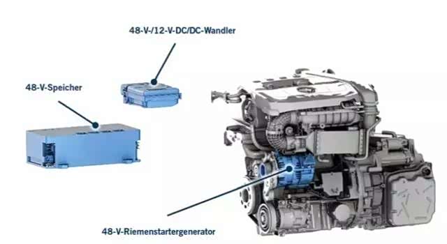 48伏mHEV系统使用一个250Wh容积的锂电池,电池位于前排右侧地板下方而非后备箱中,左侧则是DC/DC转换器。48伏起动机/发电机则位于传统起动机的位置,通过皮带经由张紧轮与空调压缩机、曲轴相连。起动机/发电机的最大功率为12kW,用于发动机启动、能量回收以及Boost功能。为了应对冷启动,传统的12伏起动机依然存在。
