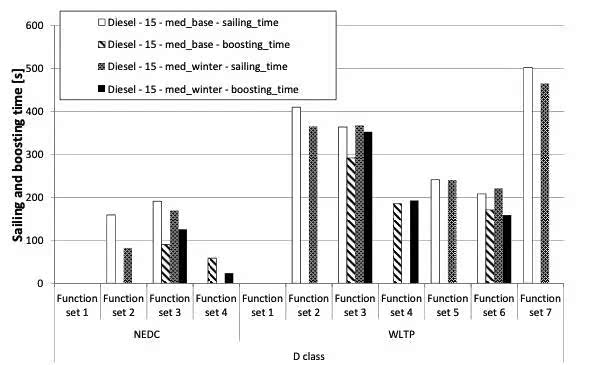 ▲NEDC与WLTP工况中熄火滑行-48伏系统Boosting工况的累计时间对比
