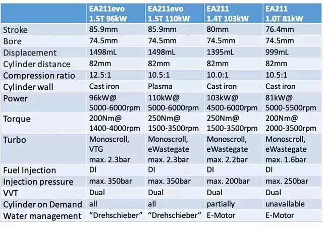 EA211evo机型的动力指标与之前的EA211系列差异不大,按照功率分为高(110kW)低(96kW)两种版本。机械结构设计依然是模块化思路,两台机型的基础设计相同,只在配置、工艺以及后装组件稍有不同,以形成差异。EA211evo也会是大众集团拓展种类最为丰富的全球机型,“扔掉”一个缸的1.0升三缸机取代短冲程的1.2升四缸机,适应48V mHEV(可能也包括12V mHEV)、天然气、生物燃料,还要有供应GTE车型的高压PHEV机型(润滑、冷却系的额外要求)。