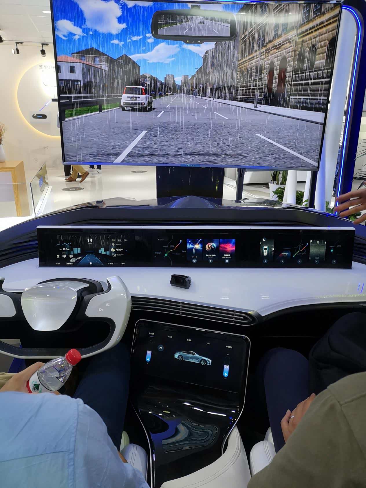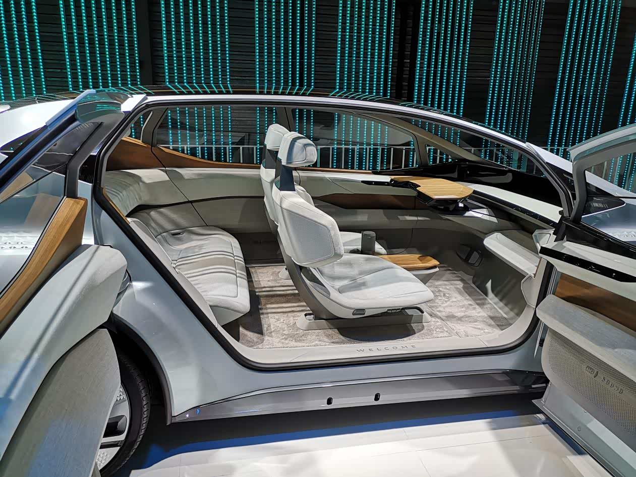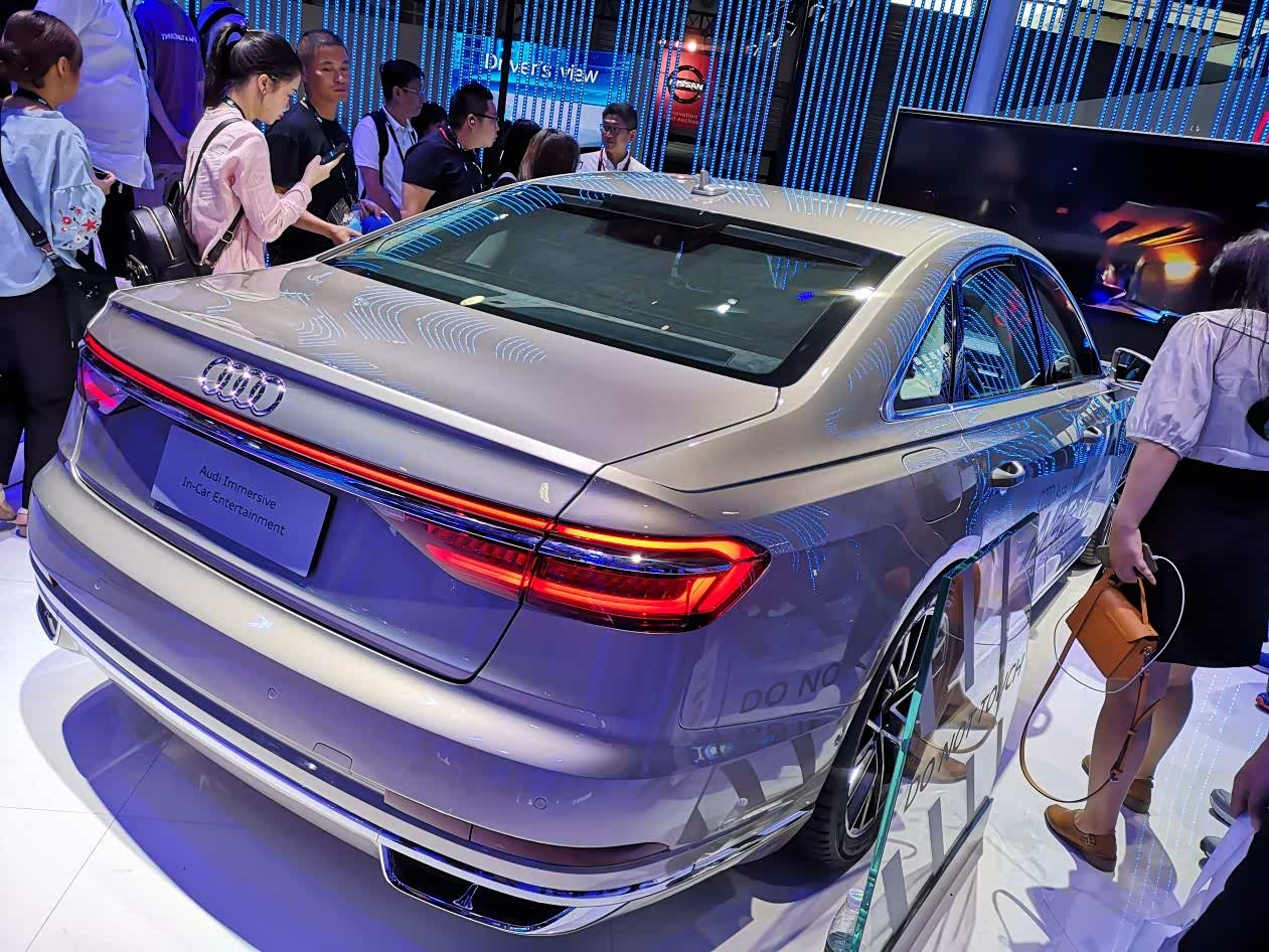 第一台,就是一台用来展示沉浸式车载娱乐系统的A8L。在停车状态,该车可以通过主动悬架的俯仰振动,来配合游戏或电影的场景,就像看4D电影。而通过实时匹配车辆路况数据,其搭载的VR系统还可辅助增强行车的信息应用、娱乐应用与舒适应用。