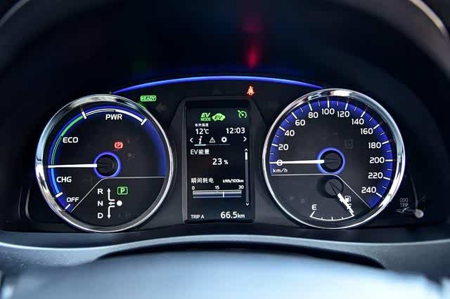 雷凌双擎E+使用了机械指针仪表,并将纯汽油车型的转速表换成了能量指示表,中间为一块4.2英寸的液晶屏幕,可以显示续航、充电状态等信息。