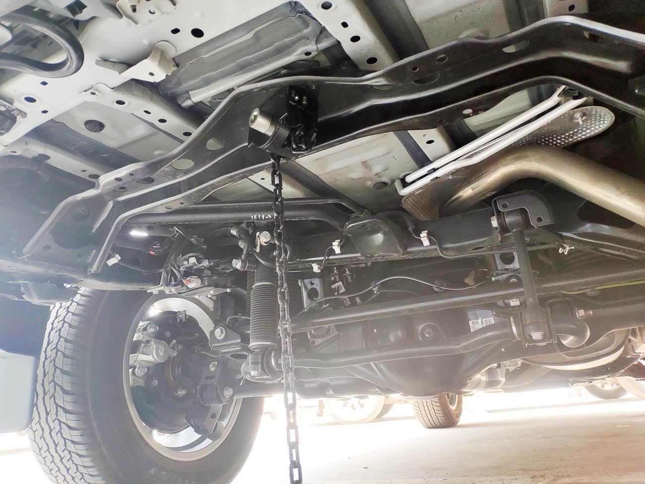 虽然车辆版本为后挂备胎型,但厂家在底盘上预留了备胎支架,只要自行配备升降器就可以了,升降器直接装入备胎支架。