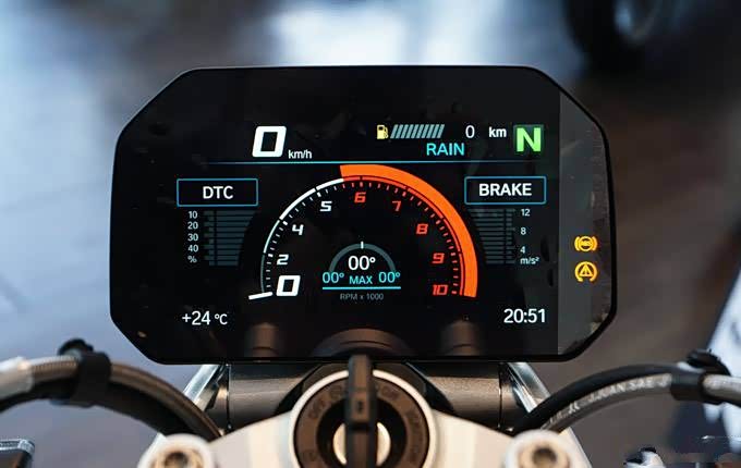 R1250R也配备了新型6.5寸TFT全彩液晶仪表,新增Sport显示模式 显示方式以转速表为主,两侧还有刹车力道和DTC运作的图表显示