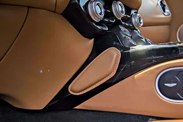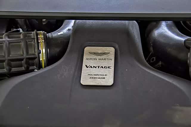 最后聊点核心部件,V8 Vantage动力系统使用奔驰AMG提供的4.0L V8双涡轮增压发动机,不过发动机安装匹配工作依然是由阿斯顿·马丁的工程师团队全权负责,所以铭牌这里跟AMG不同。发动机最大功率:375kW(510Ps)/6000rpm,峰值扭矩:685Nm/2000-5000rpm。另外,发动机盖开启拉手在副驾驶下面,因为这在英国是右舵车,所以来到国内后没有挪过来。