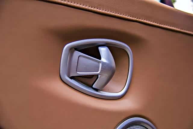 全车皮革采用非常复杂细密的缝线,就连车顶都采用了翻毛皮,这样的工艺覆盖了车内每一寸可以覆盖的面积,从仪表盘到中控再到方向盘,还有车门饰板以及那个经典的“船锚”车门拉手。