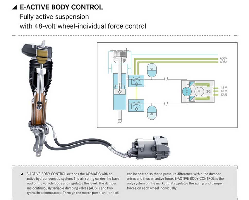 这个技术是从奔驰S级上的ABC主动悬挂控制系统(全称:active body control)延续而来,但是采用了电控后的ABC有了更多的花样。