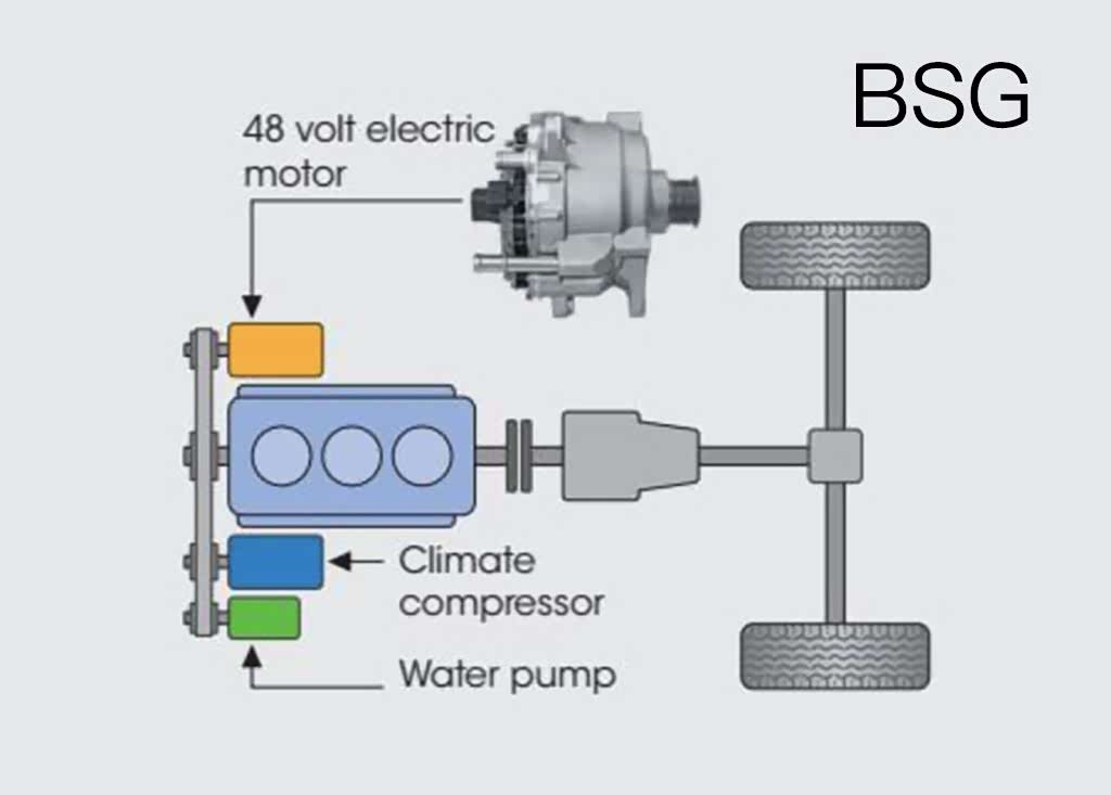 BSG是一个比较常见的48V混动形式,全称是Belt Driven Starter Generator,也就是皮带驱动式启动机/发电机,这个轻混动系统的电机是通过皮带与发动机进行连接的。