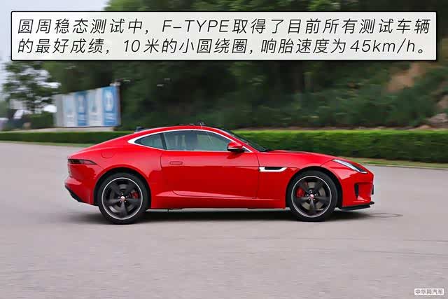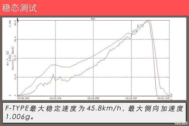 捷豹F-TYPE P300的最大稳定速度为45.8km/h,最大侧向加速度为1.006g,这一成绩或许是麦弗逊悬架永远达不到的程度。同时出色的底盘刚性加上强有力的减震器仍能稳住车身,车辆绕圆时,车身姿态保持的很好。