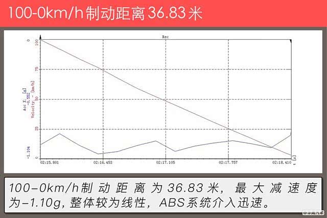 捷豹F-TYPE P300的悬挂调校很运动,质心转移很快,所以在紧急制动时车内感受非常明显,不过车身并未发生左右摆动和轮胎滑动的现象。多亏了它有着前后50:50的黄金配重比,以及车身稳定系统的积极运作,才能在高速时稳住这么一台后驱车型。同时制动踏板行程分配合理,没有出现ABS介入时的弹脚现象。最终经过多组测试后,捷豹F-TYPE P300 100-0km/h的制动成绩为36.83m。