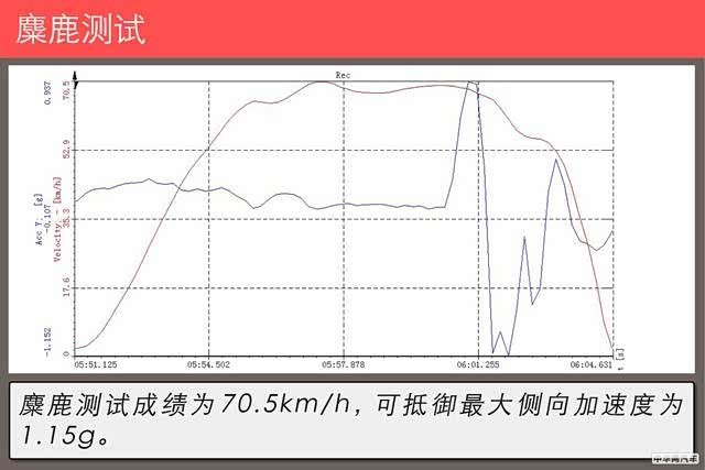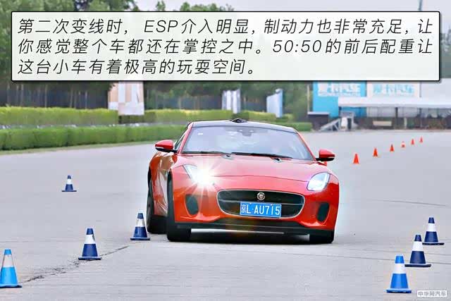捷豹F-TYPE P300的最大入桩速度为70.5km/h,能够承受最大1.15g的侧向加速度,并且在连续两次并线时,ESP会及时介入并进行制动。该成绩超越了绝大部分同级车型,出色的底盘系统以及车身刚性都是其加分项。