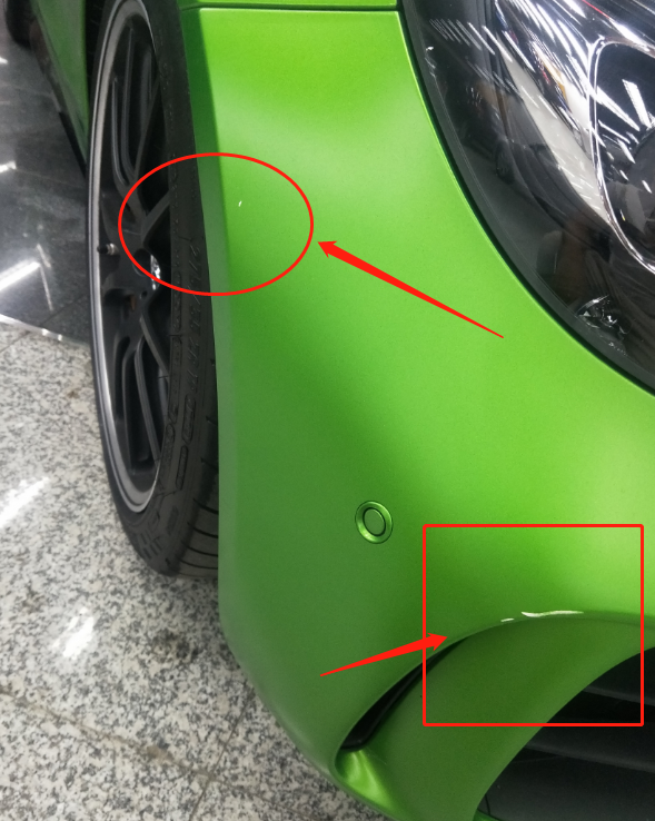 前杠右侧也有处小剐蹭,虽然只有5公分的长度,但对于这种颜色鲜艳的豪车来说还是比较明显的,看着也是心疼。个人建议客户若购买的话也没必要重新喷漆修复,打一下蜡会好一点,因为这种个性十足的车漆,再次喷漆的话很难喷出原厂的效果,而且在路上行驶时也难免会磕磕碰碰,所以没必要特意喷漆。一圈检测下来,总体来说外观还是不错的,毕竟是一台才跑了7千公里的车。
