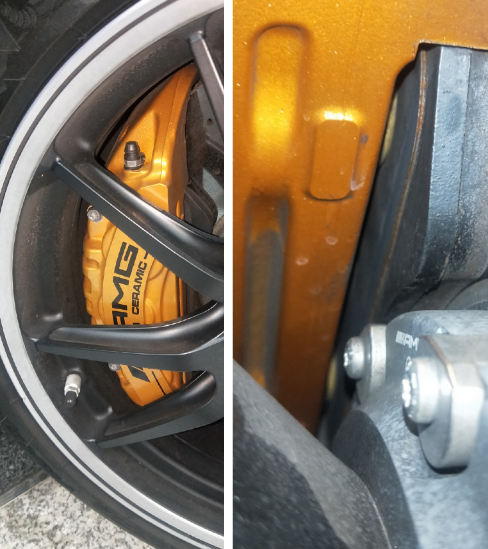 跑的快,还需要刹得住,带有AMG标志的金黄色六活塞大卡钳,配合陶瓷刹车盘,时刻都在彰显着它独特魅力,经检测刹车片磨损也比较小,暂时不用更换,轮胎和刹车片又可以节省一大笔,不过对于土豪来说这都是小事情。