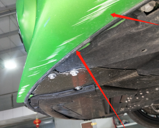 路试回来后,进行上架检测,对于这种超跑而言底盘检测尤为重要,因为太容易拖底了,果然车子刚升起来,就发现了前杠底部存在剐蹭现象,前杠护板存在轻微的拖底并有过拆卸痕迹,不过不影响正常使用,把车况反应给客户后,客户也表示这都在预期之内,不是事。