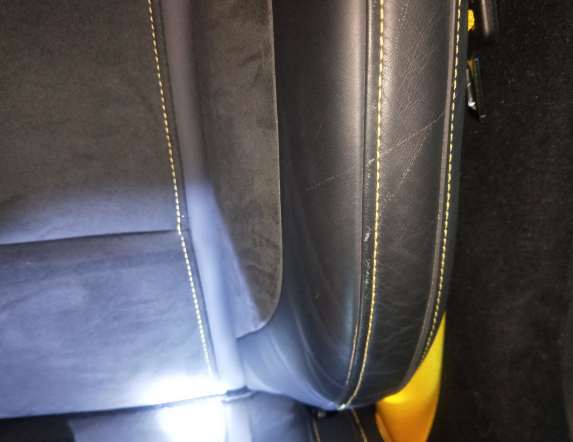 通过对座椅和方向盘的磨损判断,初步排除大范围调表的可能性,不过由于运动座椅两侧比较鼓,上下车时腰间的钥匙等物件,很容易蹭到此部位,产生轻微的划伤。