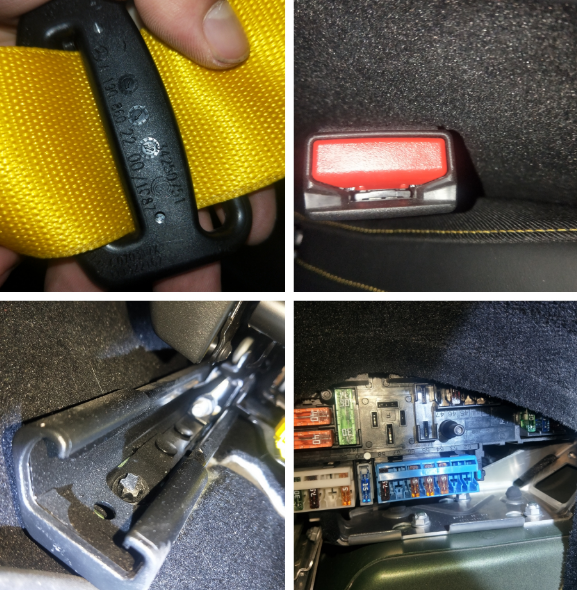 选配的骚黄色安全带相当耀眼,经检测生产日期跟整车出产日期相符,安全带卡扣、座椅骨架、保险盒等位置也没有发现水泡生锈,发霉等痕迹。