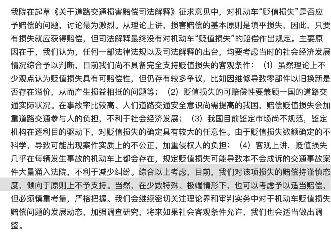 其实,在先前最高院发布的《关于交通事故车辆贬值损失赔偿问题的建议》中,有表示因为以下四点,一是汽车零部件溢价而产生损益相抵的问题,二是兼顾实际的交通环境,三是鉴定贬值损失的方法并不完全科学,四是客观上讲,每次事故过后都造成贬值,等实际问题的存在,对车辆贬值赔偿持谨慎态度,倾向于原则上不予支持。不过,同时也说明了在部分特殊情况下,也可以考虑予以适当赔偿。