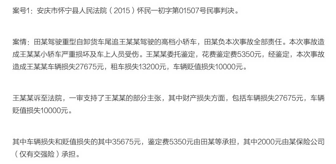 大师在网上找到了两起案例可以给大家参考下,都是索赔车辆贬值的成功案例。