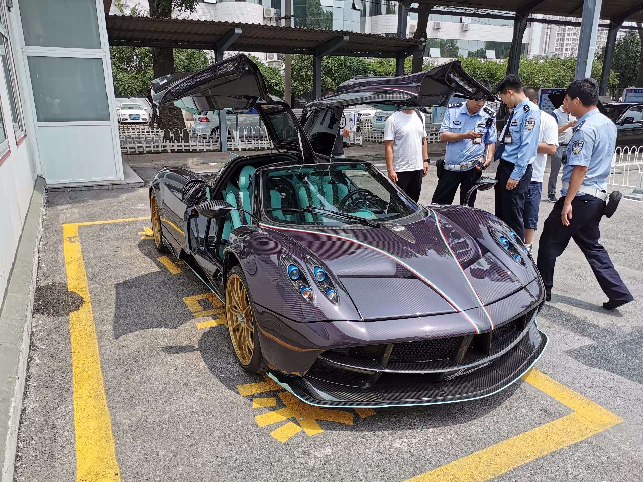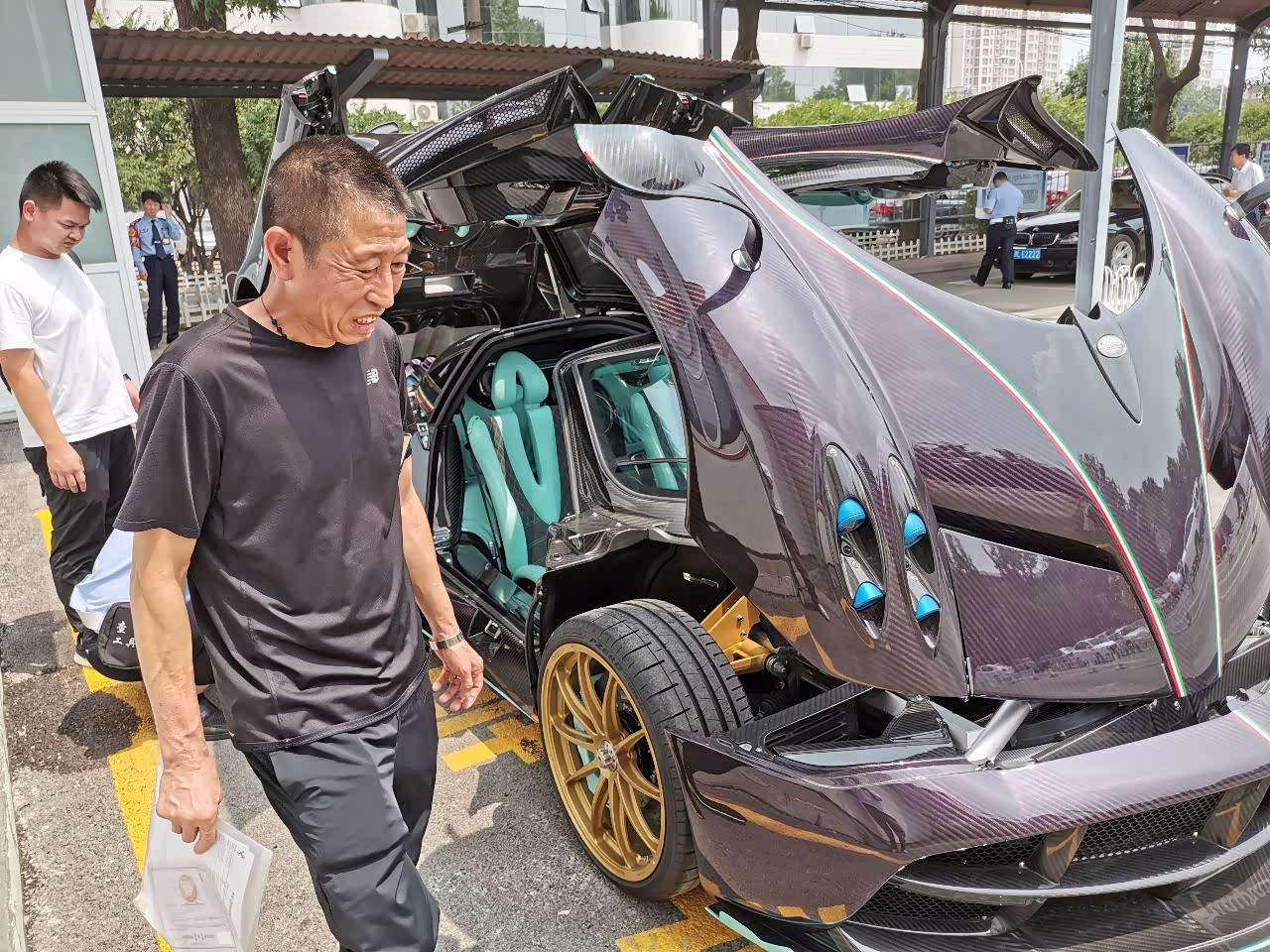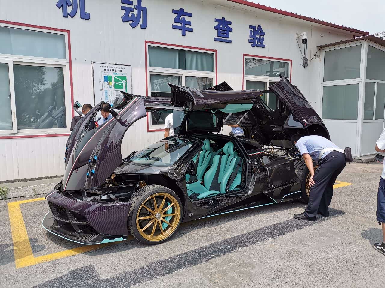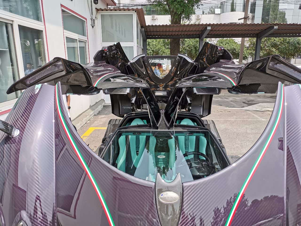 四个独立式的车灯结构,科技感十足,全车大灯原件都是由海拉提供的。金色的轮毂也是睚眦的专属,和紫色的车身颜色相搭配,效果很突出。风神车型都是鸥翼式的开门设计,打开的时候相当炫酷,尤其是在这做车检的时候,引擎盖,车门,前盖都打开的时候,简直就是一个艺术品。风神是中置引擎后轮驱动,搭载6.0 V12引擎,马力730匹,扭矩1000牛米。由于都是碳纤维材质,舱盖就算是女生都能轻易掀开。