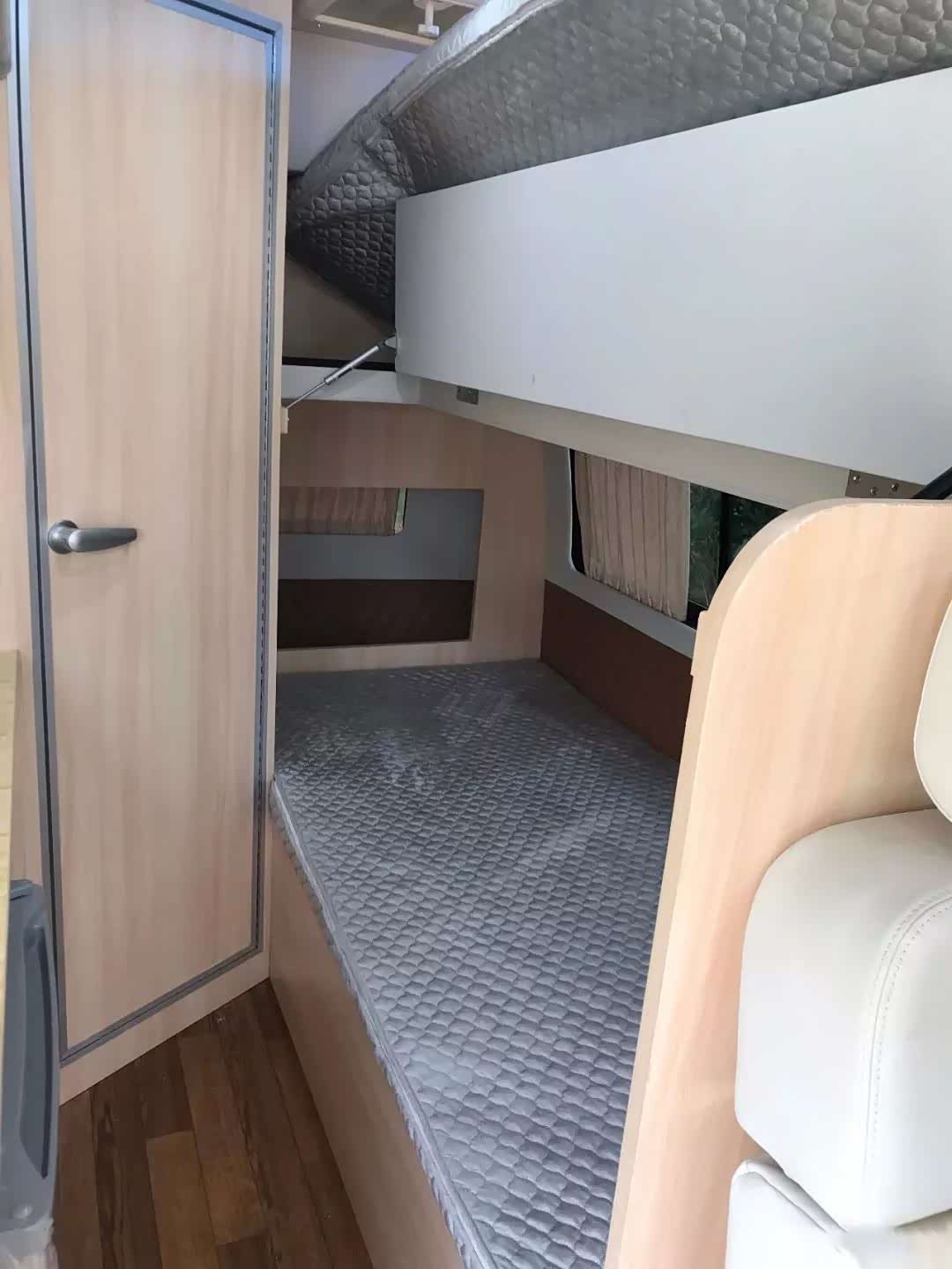 车尾采用了纵置的上下双人铺设计,可以供4个成年人休息使用,上铺侧面的氛围灯,与车内设计相得益彰,温馨舒适的氛围颇有一种家的感觉。