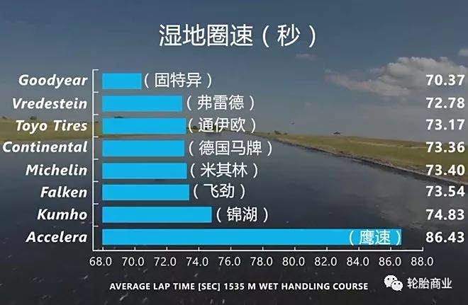 固特异在湿地表现让人眼前一亮,费雷德、通伊欧、德国马牌、米其林、飞劲、锦湖基本不相上下,鹰速轮胎表现较差。