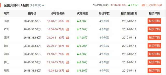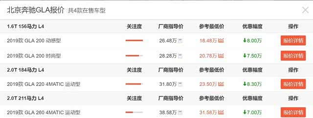 至于购买建议的话,今年早些时候,奔驰也响应增值税税率调整政策下调了GLA的官方指导价,所以首先从车型年款上说,2019款车型的优惠金额与2018款车型相当,自然是2019款车型更值得购买。其次从优惠价格趋势来看,奔驰GLA的优惠幅度近期可能会保持在目前的水平,也就是有6万元左右的优惠,或许到了第三季度末会有更高一些的优惠。