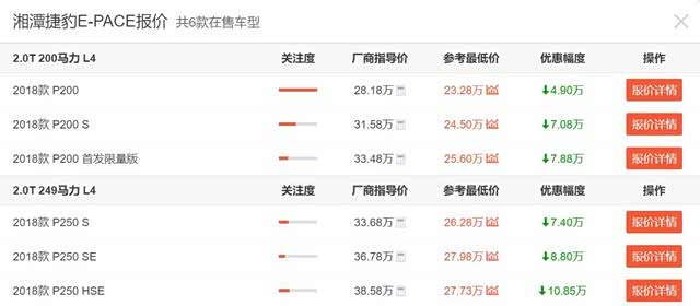 第二款很多朋友会好奇,怎么不是宝马X1,奔驰之后不应该就是宝马吗?的确,宝马X1目前也有着很高的优惠,终端甚至已经跌至20万以内了,所以要说X1我当然也是十分推荐购买的。今天之所以没有推荐,最主要也是因为上次刚刚才推荐了,所以为了避免有做广告的嫌疑,这里师哥就不再过多讲述了,反正大家也都知道宝马X1优惠很大就行。而捷豹品牌的影响力其实在国内外也是相当不错的,操控比肩宝马,造型又十分优雅,师哥认为非常适合那些年轻的精英消费人群。捷豹E-PACE在去年8月29日上市,在今年年初的时候下调了官方指导价。近日,我们从青岛某经销商处获悉,捷豹E-PACE目前最高可享10.85万元现金优惠。相当于打了7.6折,所以整体是非常值得入手的,厂商指导价:28.18-38.58万,参考最低价:23.28-27.98万,对于手握20万多想买好豪华SUV的年轻人来说,捷豹E-PACE是个不错的选择。