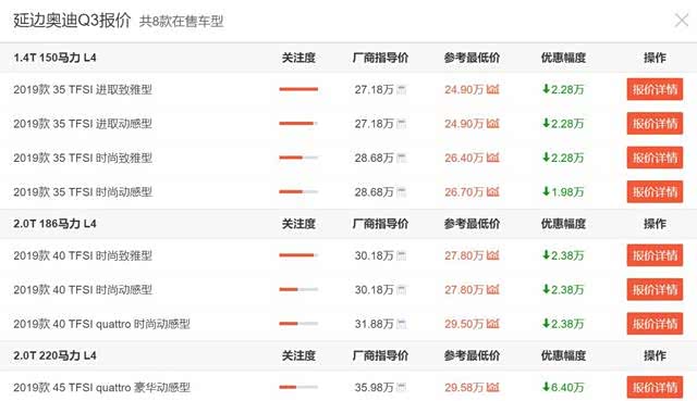 第三款车就是来自奥迪旗下的Q3车型了,全新一代Q3于今年上海车展期间正式上市,但同时不少经销商还库存有老款车型。不过今天我们说的却并不是老款车型售价,而是新款,毕竟新款目前也有不少的优惠条件。具体来看,奥迪Q3厂商指导价:27.18-35.98万,而参考最低价则是来到了24.90-29.58万 ,也就是说目前有最高6.4万的优惠,因此整体来说全新一代Q3的价格也还是已经有了一定松动的,对于想要购买奥迪Q3这款车的朋友来说我觉得还是可以入手的。