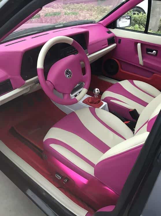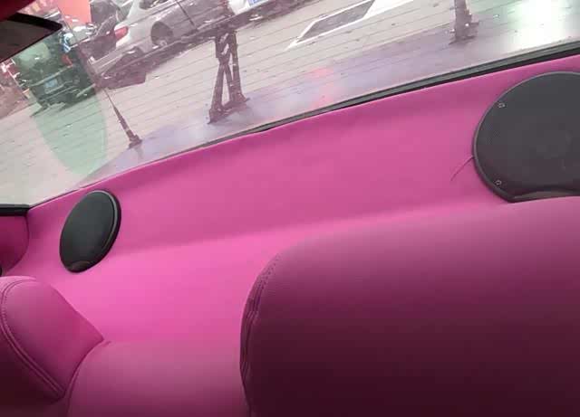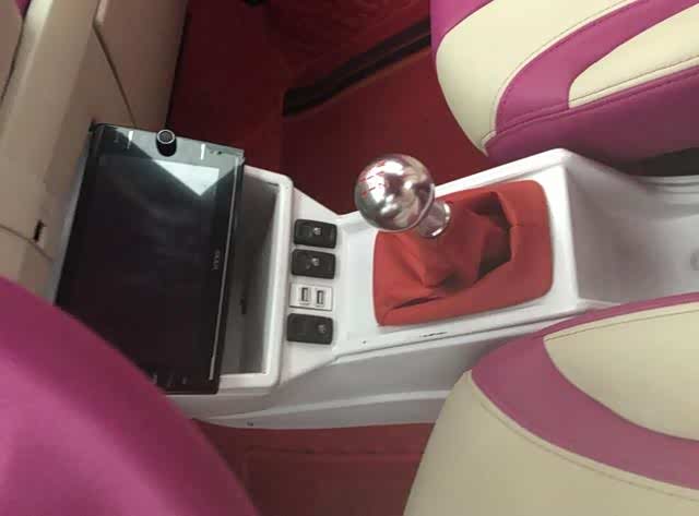 此外,粉色系的真皮方向盘,以及金属质感十足的换挡杆,看起来也颇具个性味道。车内还加装了中控大屏,不过,就是位置有些尴尬!并且车内还重新改装了音响系统,特别是后排座位后面配有两个低音炮,试听了一下,概括起来就俩字“震撼”!