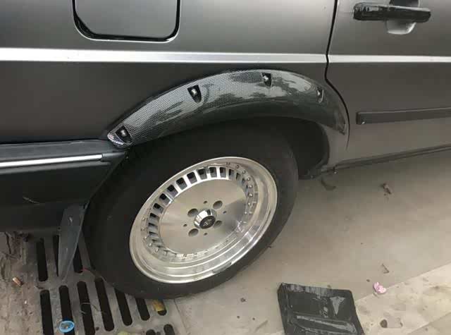 轮毂:原车轮毂为14英寸大众轮毂,形貌平平,有时还会觉得有点“丑”!(个人观点)但是,改装了18英寸的大饼复古轮毂之后,简直有种“穷屌丝”逆袭成“高富帅”的感觉,真时一个天上一个地上。不过,由于改装了大尺寸的轮毂,改装时切割了原车的叶子板,并重现加装了碳纤维外抛轮眉,看起来动感十足。