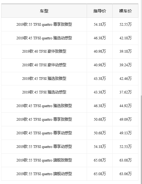 奥迪A6L,目前有2019款 55 TFSI quattro 尊享致雅型,2019款 45 TFSI quattro 臻选动感型,2019款 40 TFSI 豪华致雅型,2019款 40 TFSI 豪华动感型,2019款 45 TFSI 臻选致雅型等多个版本,官方指导价格区间为40.98-65.08万,上市累计综合口碑评分4.42分,获得不错的凡响。