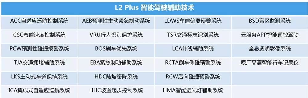 L2 Plus别智能辅助驾驶技术,其中包括ACC自适应续航、LKS主动式车道保持系统、AEB主动紧急制动系统、LDWS车道偏离预警系统、BSD盲区监测系统等。