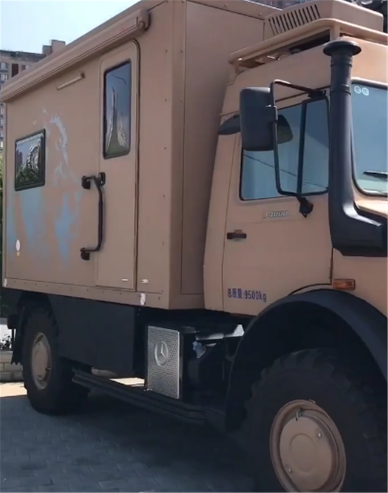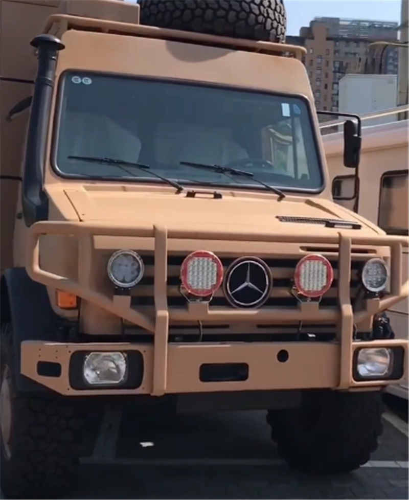 这样一辆罕见乌尼莫克U4000房车亮相街头,配奔驰标,长近6米重7吨多,比公交还高。