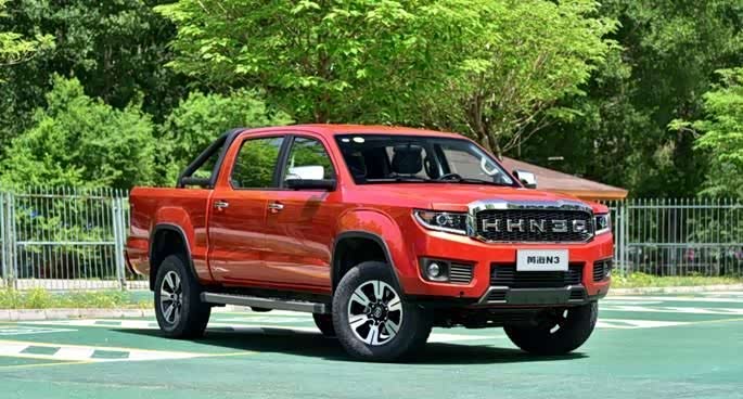 引自汽车之家图库说到 黄海N3想必很多人还是比较陌生的,毕竟在国内皮卡车市场还是很小的。黄海N3在外观上给人的感觉很有猛禽F-150的味道,前脸采用了大尺寸的进气格栅设计,而且中间镶有那“HHN3A”的英文字母,看起来很猛禽一样。而且保险杠下方采用了分隔式设计,给整车添加了几分硬朗大气。而车身侧面,相对于硬朗大气的前脸设计,车身侧面设计显示有点“小女人”,不过超车的轴距和超高的底盘设计,看起来还是很有越野性的。在车身尺寸上,黄海N3的长宽高分别为5595/1950/1865mm,轴距为3405mm。整体上来,这尺寸还是比一般的皮卡车都大一些。